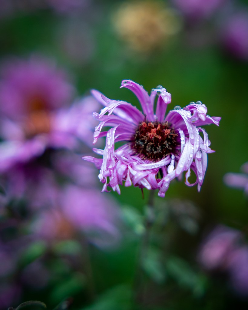 eine langsam verwelkende Blüte nach einem herbstlichen Nieselregen. Schöne Farben, interessante Formen und eine Gelegenheit die sich nur in einem sehr engen Zeitfenster ergibt. Eigentlich ein ideales Motiv. Trotzdem bin ich nicht 100% zufrieden mit dem Bild 😦